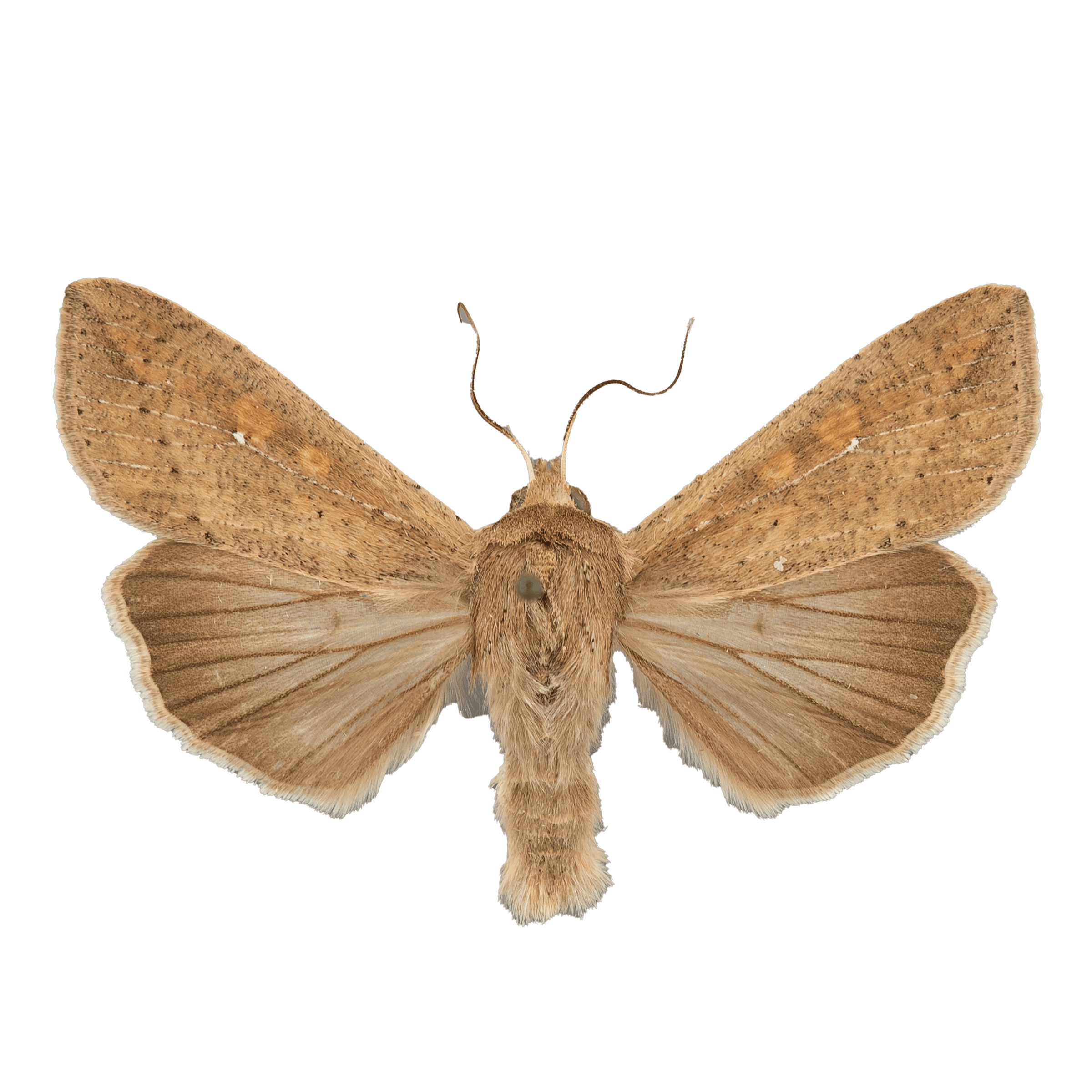 The Armyworm Moth has a wingspan of approximately 3 cm, and its wings are a mix of light and dark brown with a small white spot near the center of each forewing. The hindwings are a pale gray-brown color. The body of the moth is also brown in color with a furry appearance.