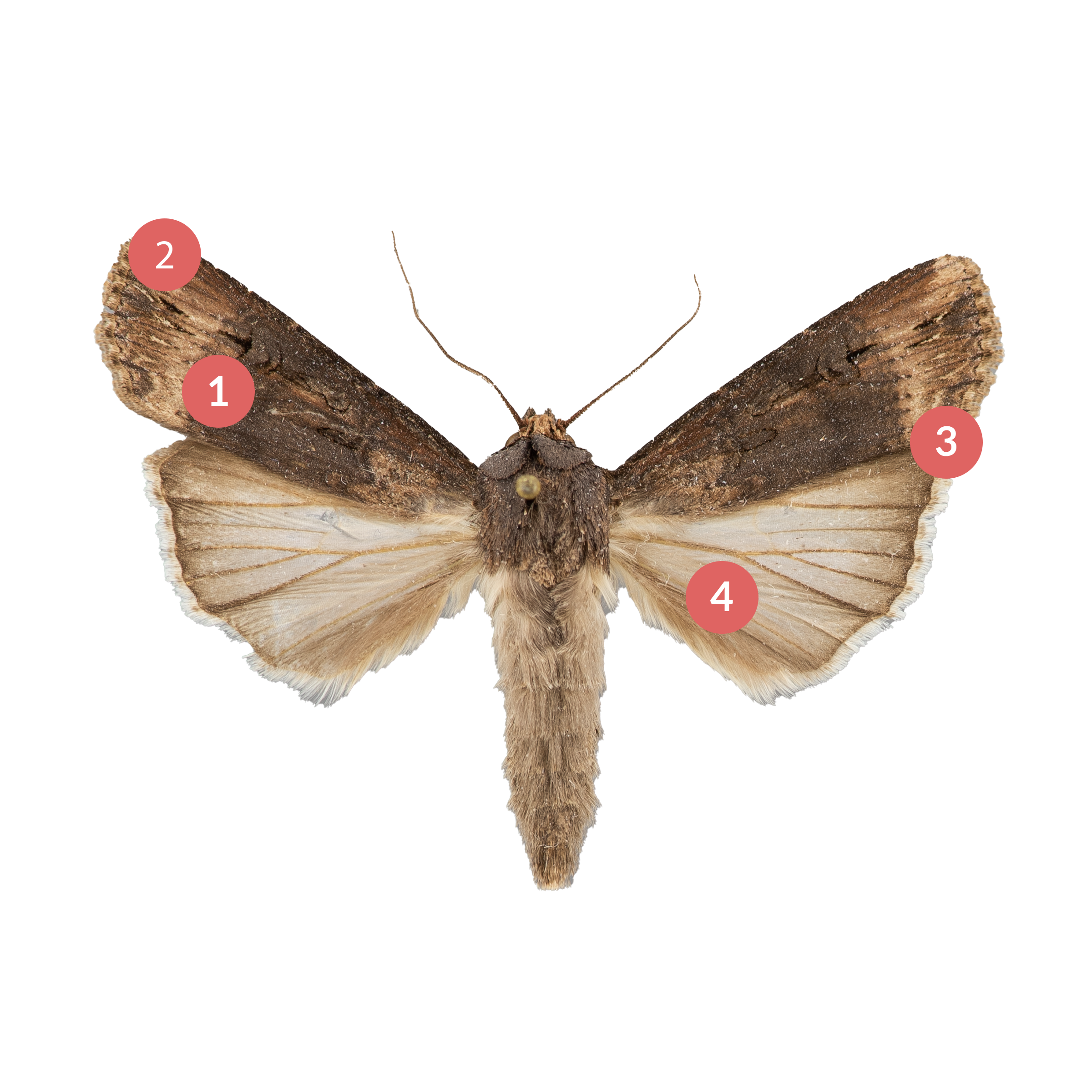 The Ipsilon Dart Moth, or Agrotis ipsilon, is a nocturnal species that can be found throughout North America, Europe, and Asia. One of the most distinctive features of this moth is the small black wedge that descends from the reniform spot, which looks like the letter ‘Y’. In fact, the species name “ipsilon” is likely derived from the Greek letter upsilon (Υ υ) due to this resemblance.