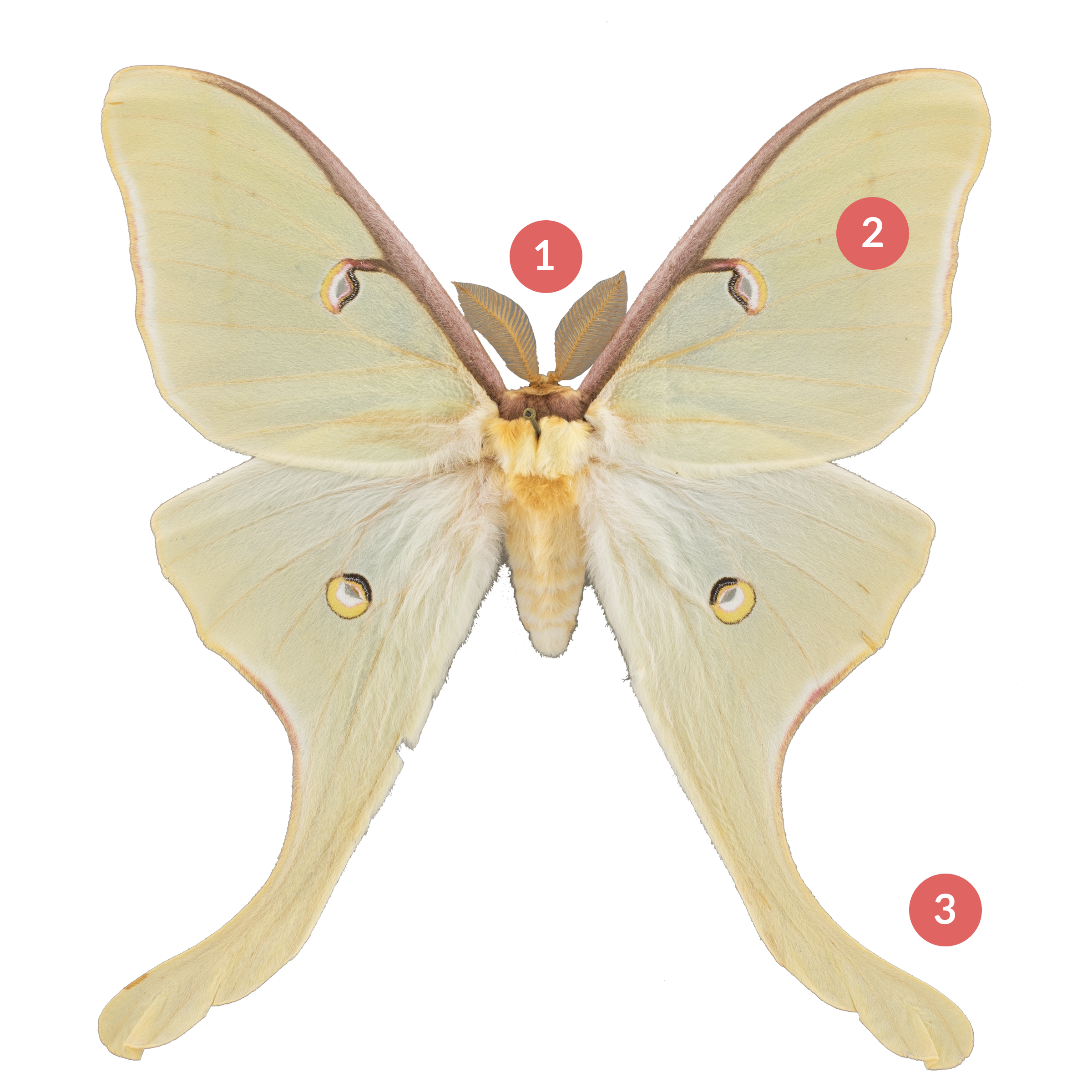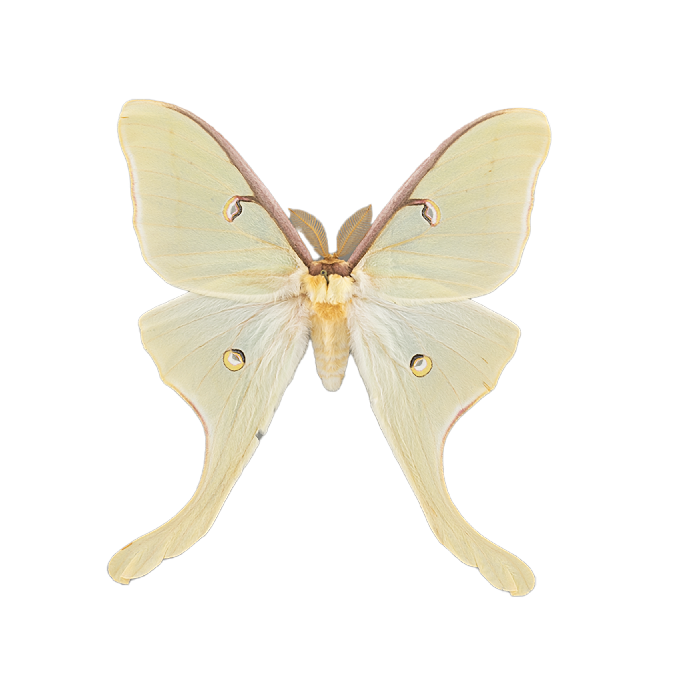 Known for its lime green color and long hind wing tails, the Luna Moth can easily be distinguished from any other species in North Ameirca. Its wings exhibit a striking combination of pale green hues, accented by shades of yellow and pale blue, while elongated hindwings and long, curving tails add to its ethereal charm.