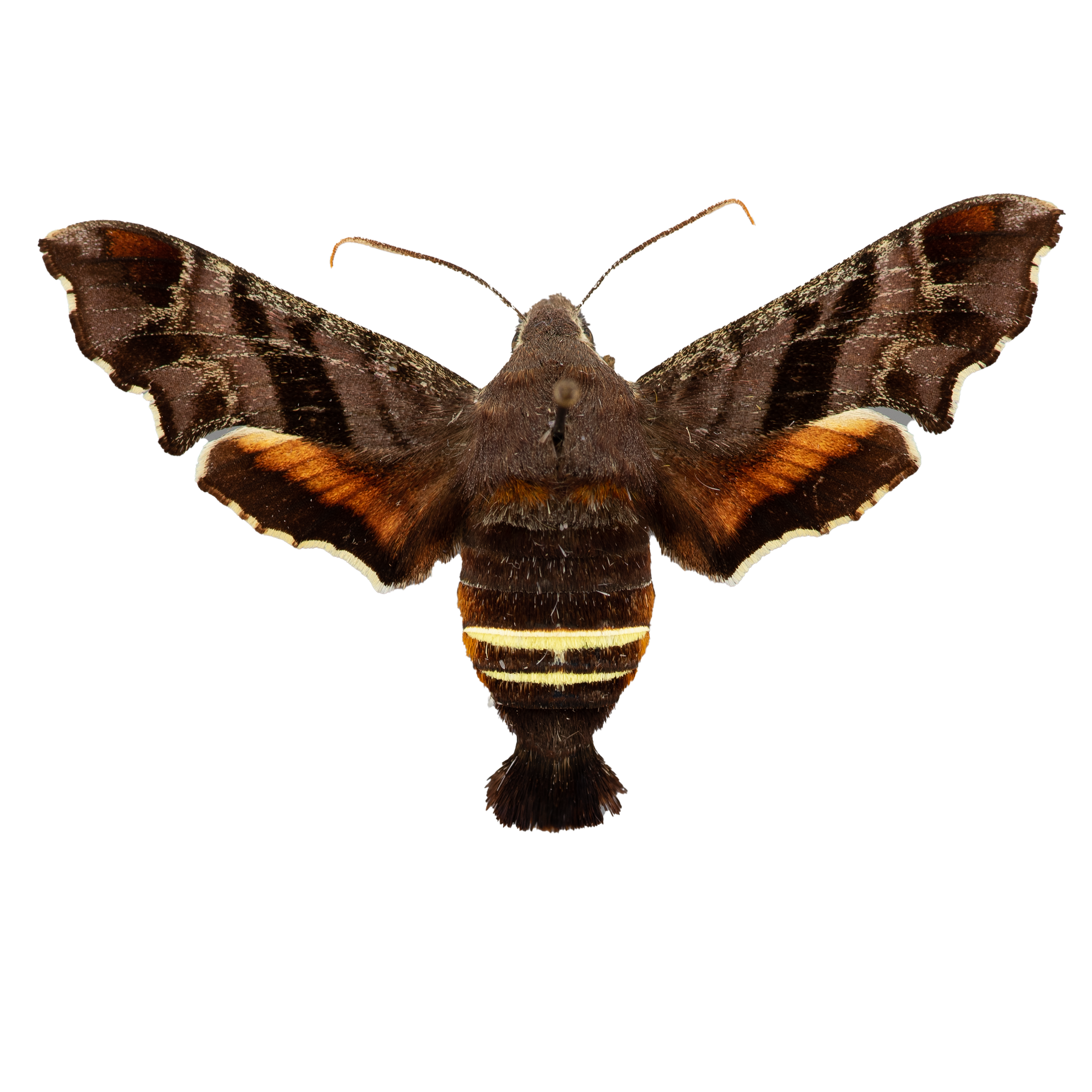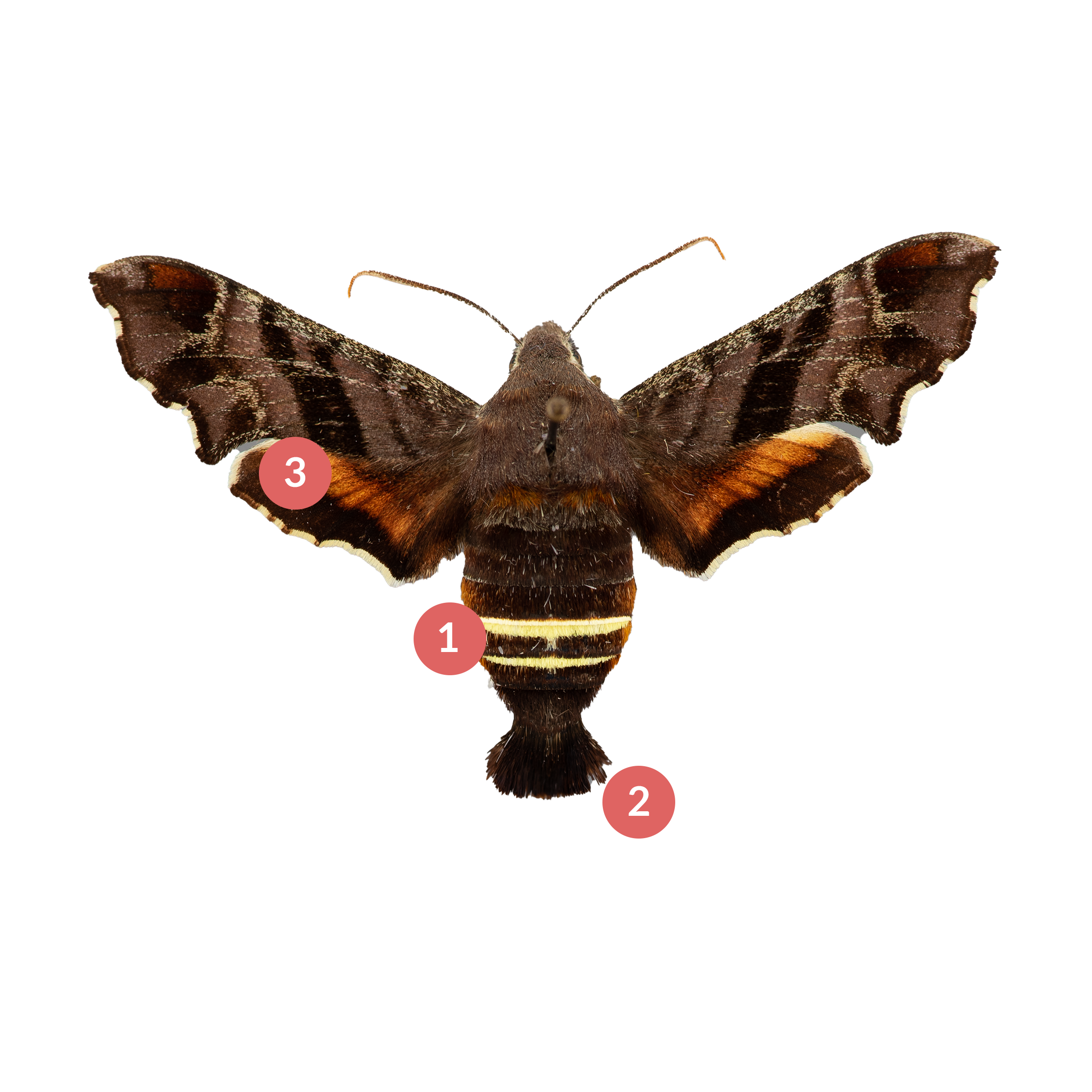 With a wingspan of up to 4 inches, it is a rapid and strong flyer, which fulfills its reputation as a member of the Sphingidae family. Its abdomen features two bold, bright yellow stripes, which are thought to mimic the markings of a wasp as a defense mechanism against predators.